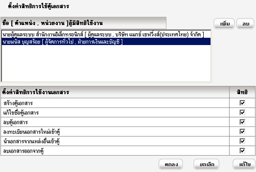 ภาพแสดงหน้าจอการกำหนดสิทธิ์ให้แต่ละบุคคลในการสร้างตู้ ลบตู้ หรือ การจัดการกับเอกสารอิเล็กทรอนิกส์ (e-Document)