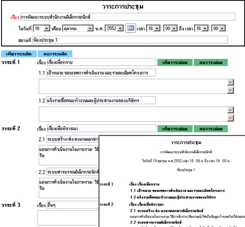 เมื่อประชุม วาระการประชุมที่สร้างไว้สามารถถ่ายโอนข้อมูลมาสร้างเป็น e-Form สำหรับการบันทึกการประชุมได้โดยอัตโนมัติ ซึ่งสามารถลงบันทึกชื่อผู้เข้าร่วมประชุม รวมทั้งผู้ที่ได้รับมอบอำนาจมาประชุมแทน