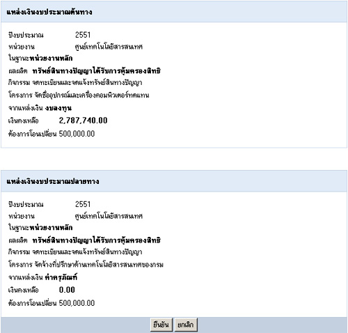 ระบบสามารถแสดงได้ว่า เป็นการโอนเปลี่ยนมาจากเงินงบประมาณของหน่วยงานใด ภายใต้ผลผลิต หรือ กิจกรรมใด โดยมีหน้าจอสรุปยอดงบประมาณคงเหลือและยอดเงินงบประมาณที่มีการโอนเปลี่ยนนี้อย่างชัดเจน