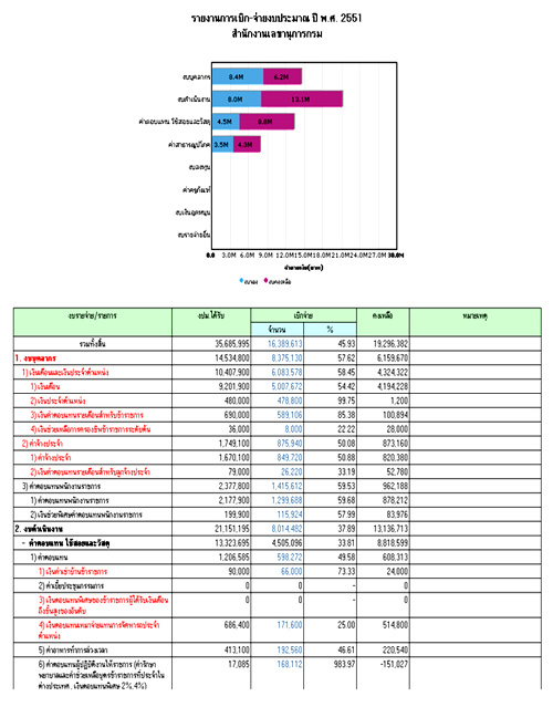 ภาพแสดงหน้าจอรายงานการเบิกจ่ายที่แสดงเป็นกราฟให้เห็นยอดเงินงบประมาณที่เบิกใช้แล้วและยอดคงหลือ