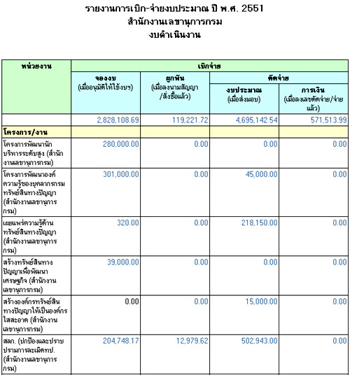 ภาพแสดงหน้าจอสถานะการจอง ผูกพัน และตัดจ่ายเงินงบประมาณของแต่ละหน่วยงานและโครงการ
