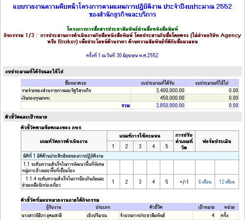 แบบฟอร์มการวัดผลเหล่านี้ สามารถสร้างและกำหนดเป็นมาตรวัดได้โดยเจ้าหน้าที่ผู้เกี่ยวข้อง ซึ่งเมื่อมีการรายงานผลการดำเนินงานแต่ละโครงการของแต่ละหน่วยงานระบบก็สามารถนำเข้ามาประเมินผลและออกรายงานตามแบบฟอร์มเหล่านี้ได้ในทันที และสามารถรวมเป็นคะแนนรวมของหน่วยงานที่รับผิดชอบโครงการต่างๆ ได้ โดยรายงานผลการดำเนินงานนี้สามารถทำได้ตามช่วงเวลาที่กำหนด
