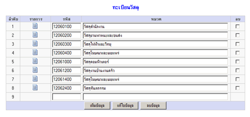 ภาพแสดงหน้าจอทะเบียนวัสดุ/วัตถุดิบในแต่ละกลุ่ม