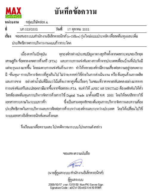 ภาพแสดงเอกสารบันทึกข้อความอิเล็กทรอนิกส์(e-Document)แบบ XML (Extensible Markup Language) ที่สร้างจากแบบฟอร์มอิเล็กทรอนิกส์ (e-Form) และผ่านการลงนามอิเล็กทรอนิกส์ (Electronic Signature)