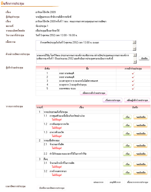 เมื่อประชุม วาระการประชุมที่สร้างไว้สามารถถ่ายโอนข้อมูลมาสร้างเป็น e-Form สำหรับการบันทึกการประชุมได้โดยอัตโนมัติ ซึ่งสามารถลงบันทึกชื่อผู้เข้าร่วมประชุม รวมทั้งผู้ที่ได้รับมอบอำนาจมาประชุมแทน