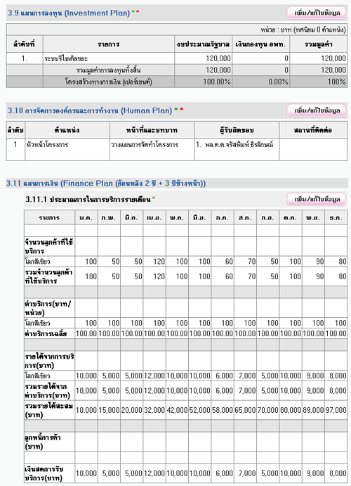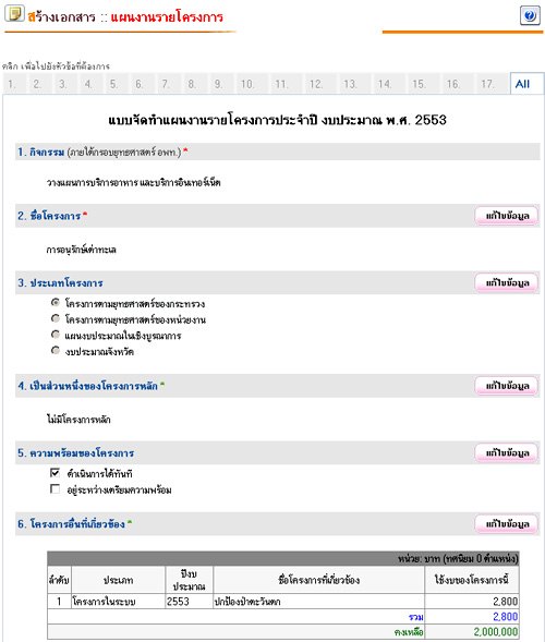 ภาพแสดงหน้าจอหัวข้อบางส่วนของการจัดทำแผนงานโครงการ
