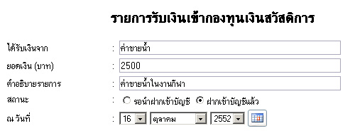 ภาพแสดงหน้าจอการบันทึกรายรับของเงินทุนสวัสดิการองค์กร