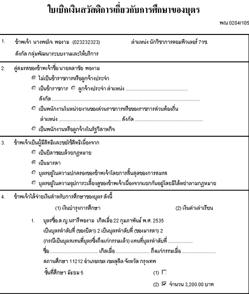 ภาพแสดงหน้าจอการเบิกจ่ายค่าเล่าเรียนบุตรผ่านแบบฟอร์มอิเล็กทรอนิกส์