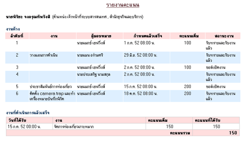 ภาพแสดงหน้าจอรายงานสถานะการได้รับงานและการปิดงานรายบุคคลพร้อมคะแนนที่ได้รับ