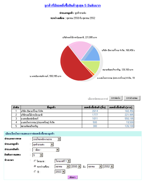 ภาพแสดงหน้าจอรายงานสถิติการสั่งซื้อสินค้าของลูกค้าแต่ละราย